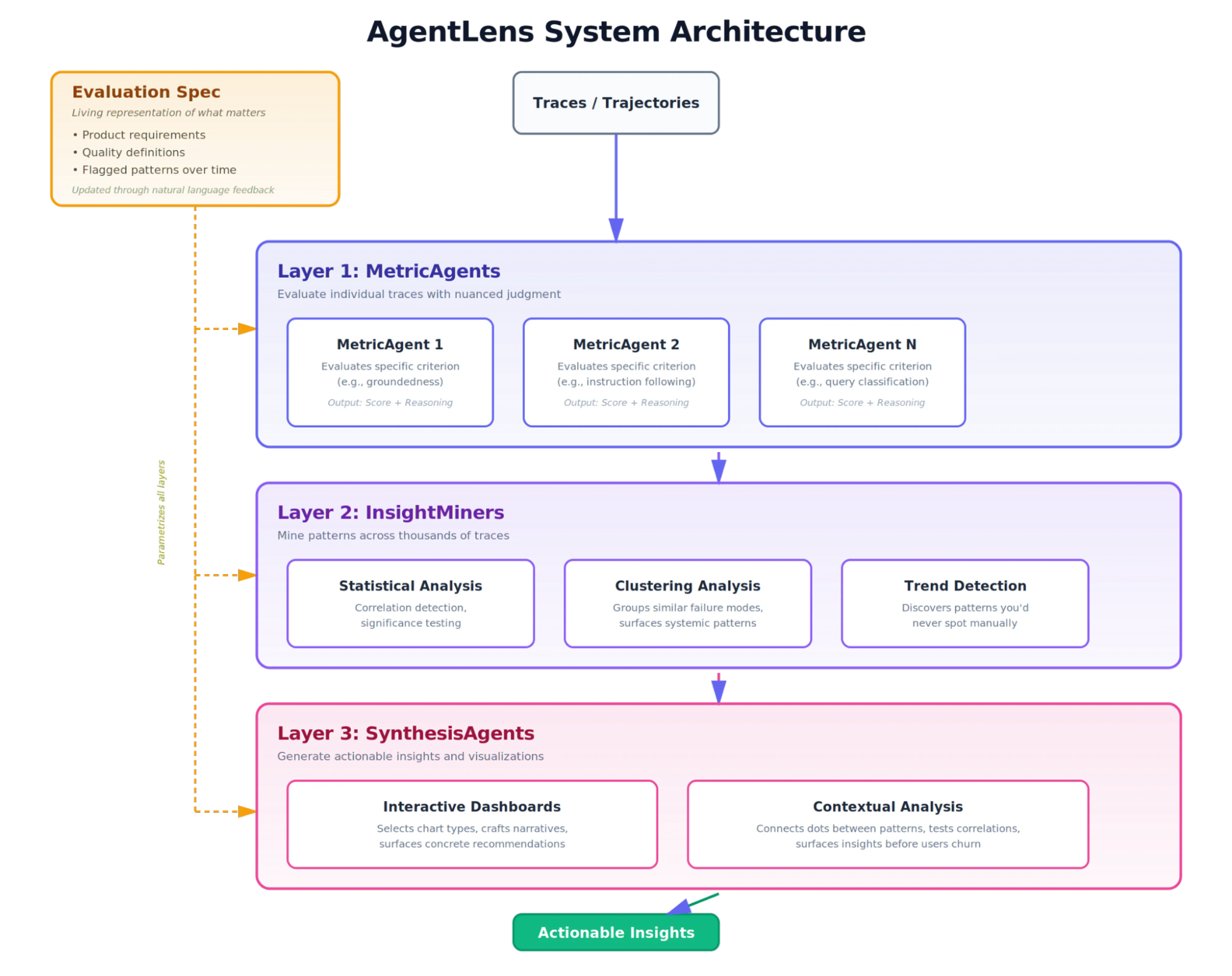 Each layer operates independently but communicates and flexibly shares data, so insights flow from individual traces up to high-level dashboards. Take the tax issue from the intro: you never anticipated tax queries and never told the system to look for them. But one MetricAgent flags these as out-of-distribution while another scores them low on instruction-following; one InsightMiner notices a growing cluster of similar OOD queries while another finds that low-performing traces disproportionately involve policy questions; a SynthesisAgent connects the dots, tests the correlation, and surfaces a visualization to your dashboard—before users start churning.