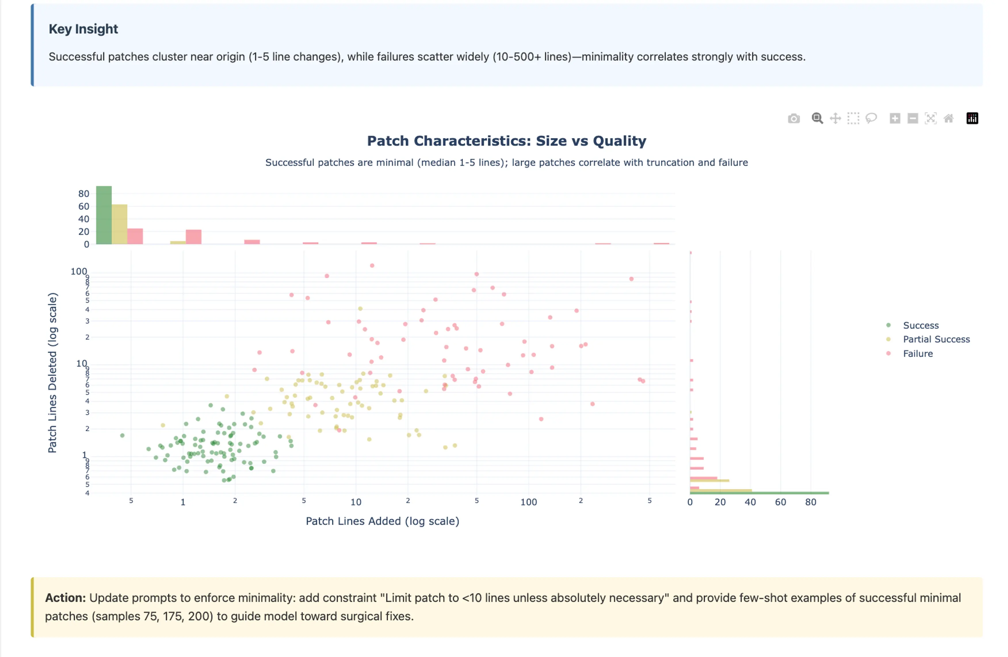 The scatter plot visualizes 225 automated code repair attempts, showing the relationship between patch size (lines added) and patch modifications (lines deleted). Each point is colored by outcome: green for success, yellow for partial success, pink for failure. AgentLens detected this correlation, chose the scatter plot format, and added marginal histograms to make the pattern visible. The takeaway: smaller edits cluster toward success, larger patches scatter toward failure.