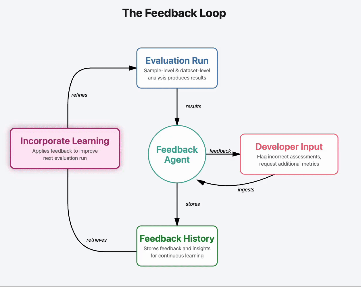 The way this works: you provide natural language feedback at any level, and the system updates accordingly. Flag a sample as incorrectly scored. Ask to explore a correlation. Point out a pattern you want to track. The system reasons about your feedback, updates the Eval Spec, and incorporates your input into future runs.