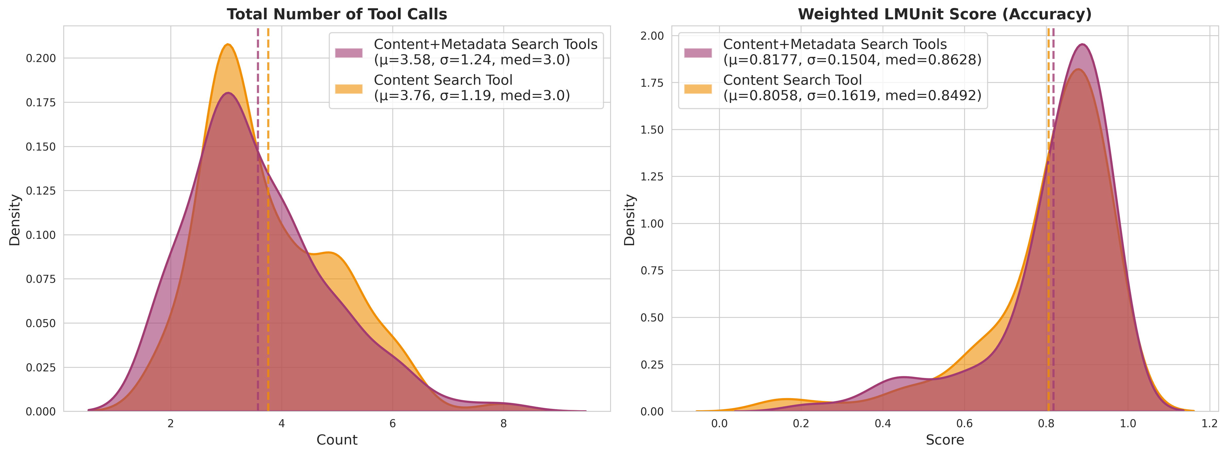 We evaluated a Claude Sonnet 4.5 agent in two configurations: one with access only to text content search, and one with access to both text content and metadata search tools.
