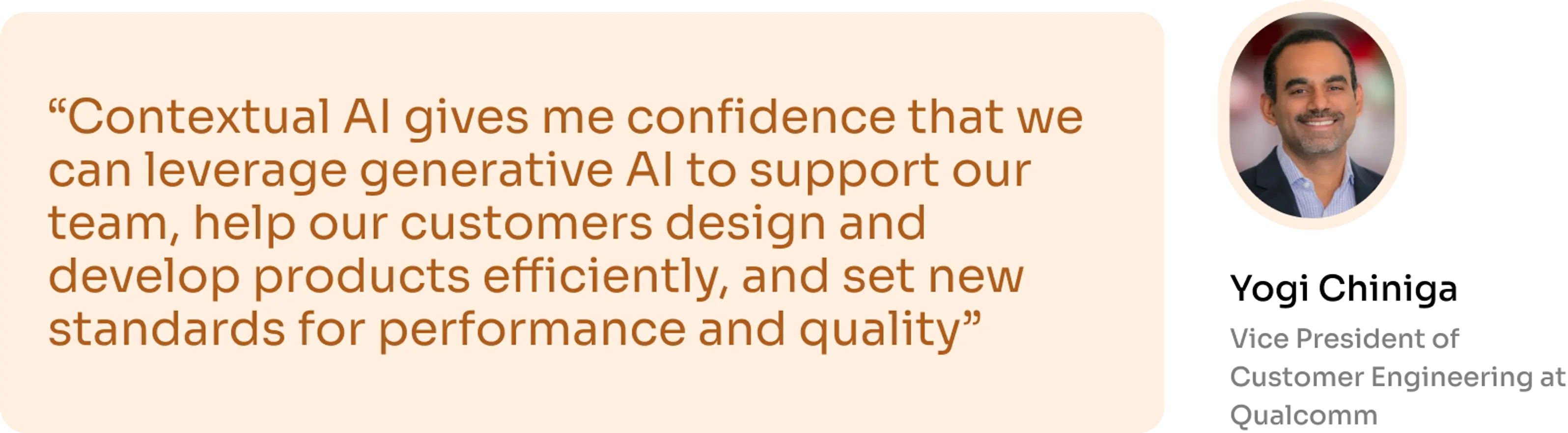 Through our early partnerships with leading enterprises, the Contextual AI Platform has been battle-tested in production across a variety of industries and functional domains. One such customer is Qualcomm, a global semiconductor leader who chose Contextual AI to support its highly technical and mission-critical Customer Engineering organization. The team sought an AI solution that could navigate and synthesize information from the company’s vast technical documentation to accelerate customer issue resolution.