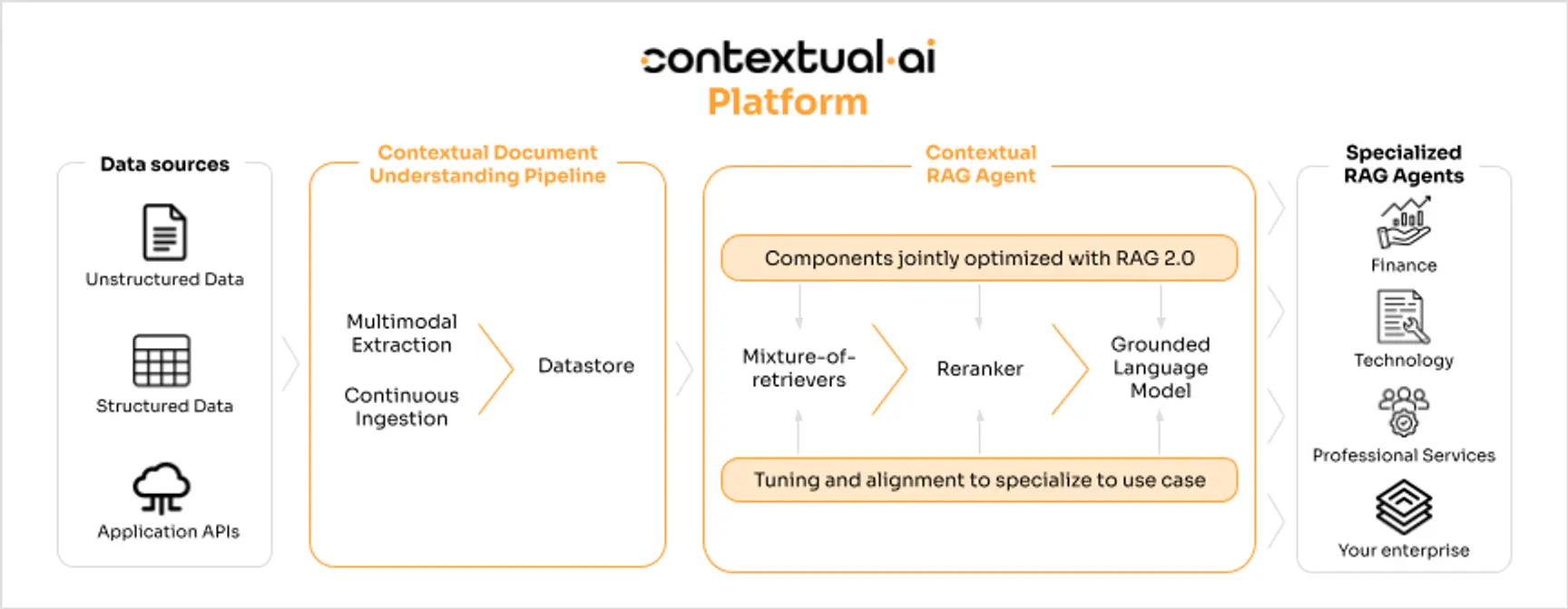 The Contextual AI Platform enables AI teams to rapidly launch specialized RAG agents that are capable of active retrieval and test-time reasoning over massive volumes of structured and unstructured enterprise data. These agents deliver exceptional accuracy in technical, complex, and knowledge-intensive workloads, such as investment analysis, engineering design support, and technical research—areas where general-purpose agents have largely fallen short.