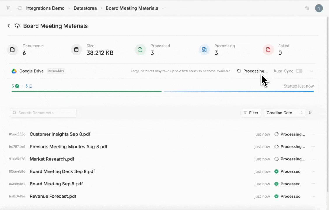 Ingesting data from third-party sources just got easier. You can now sync data directly from external systems such as Google Drive and Microsoft SharePoint. With just a few clicks, you can connect, authenticate, and select the folders to ingest into a datastore that respects existing permissions.