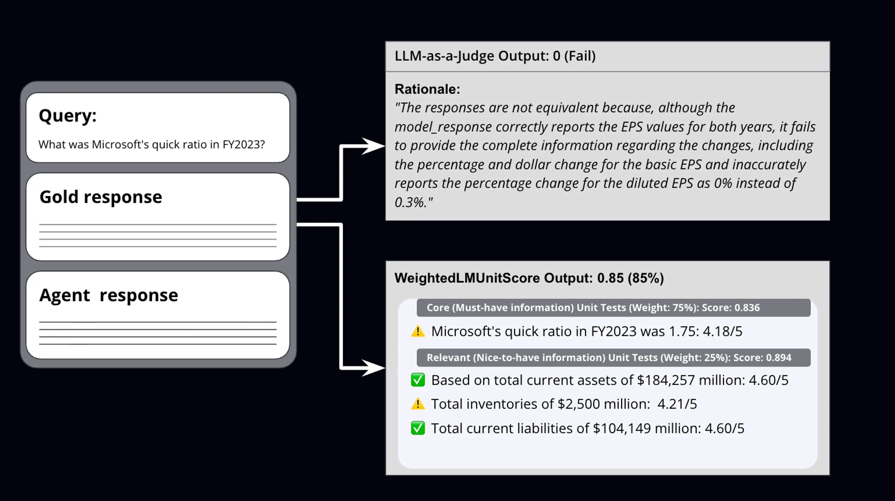 - Richer, continuous scoring instead of binary gatekeeping: LMUnit scores each unit test on a 1–5 scale (not 0/1), so “95% correct” answers can get 4.75 instead of 0, and WeightedLMUnitScore aggregates these into a 0 - 1 metric (e.g., a financial agent with one small calculation error might score 0.85), clearly distinguishing “high-quality with a minor flaw” from “unusable.”