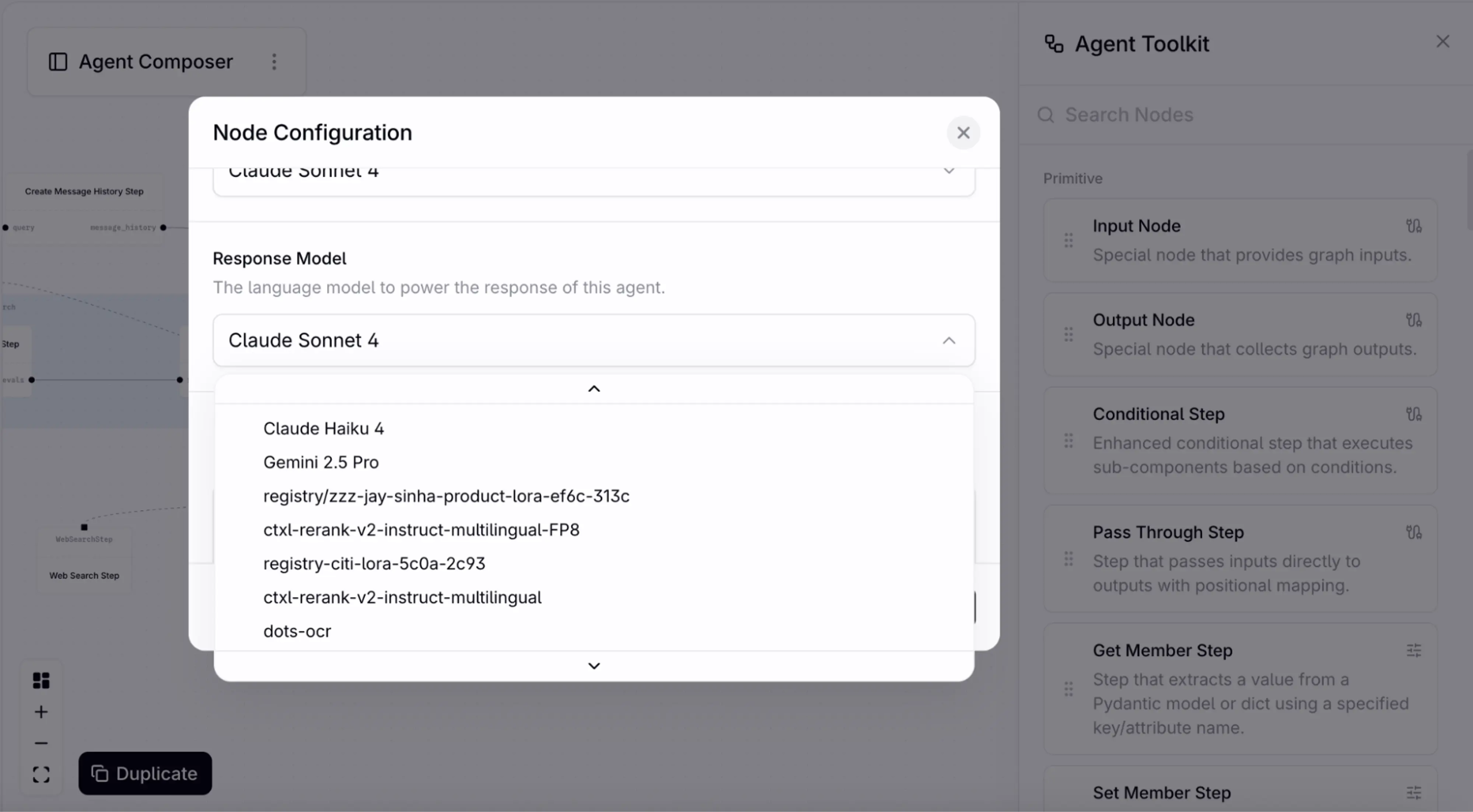 Building an agent takes only a few minutes, but production readiness is equally fast. Agent Composer makes it easy to specialize agents to specific use cases and data types. Every node of an agent is completely customizable, enabling precise tuning of prompts, retrieval parameters, and tool selection. Unlike DIY offerings, Agent Composer is completely model agnostic, ensuring you aren't locked in and can select the best model for the job.