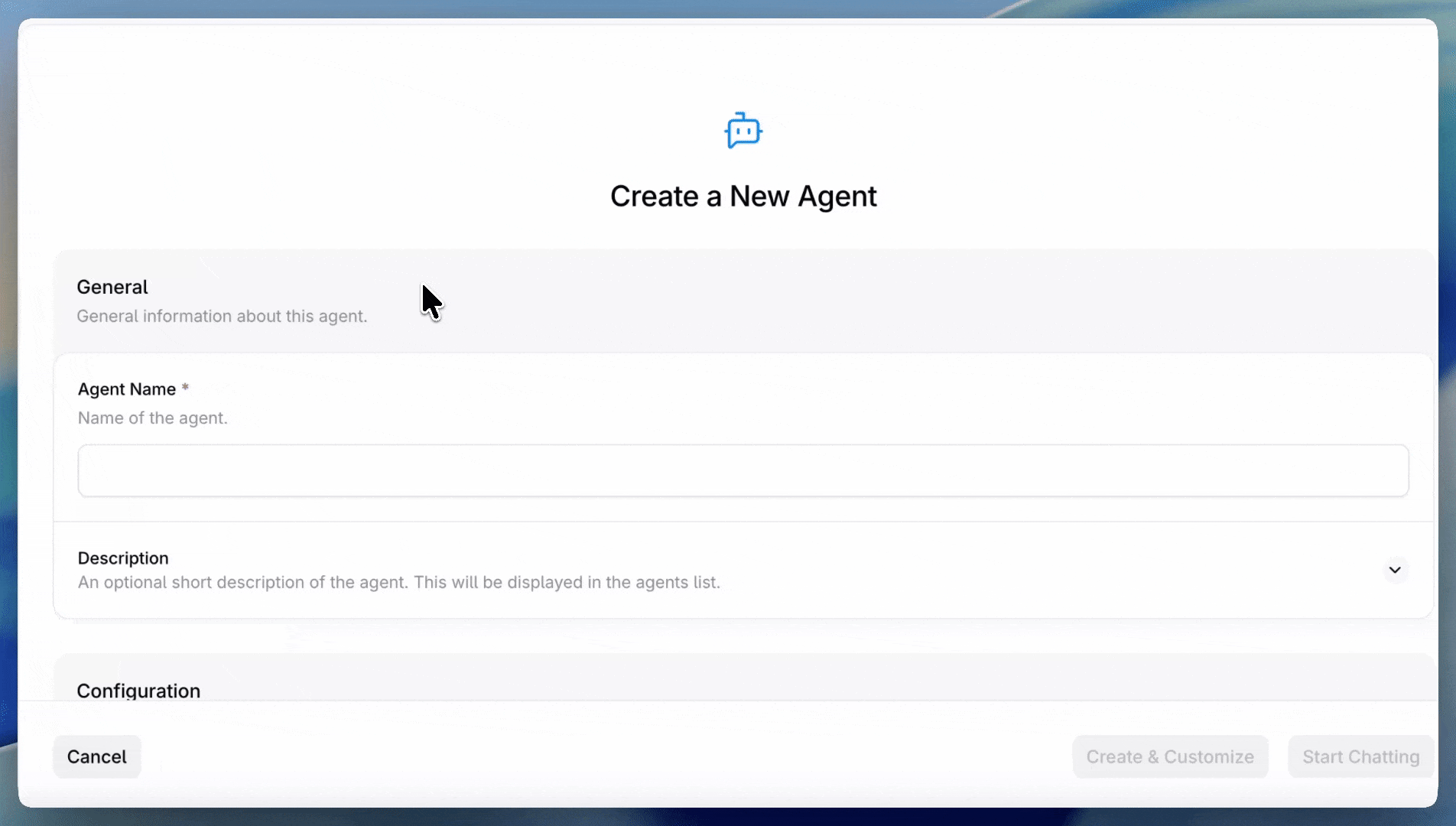 - Build from a prompt: Best for business users and rapid prototyping. Create an agent by describing your use case or workflow in natural language. In a few moments you will have a working agent to query or refine.