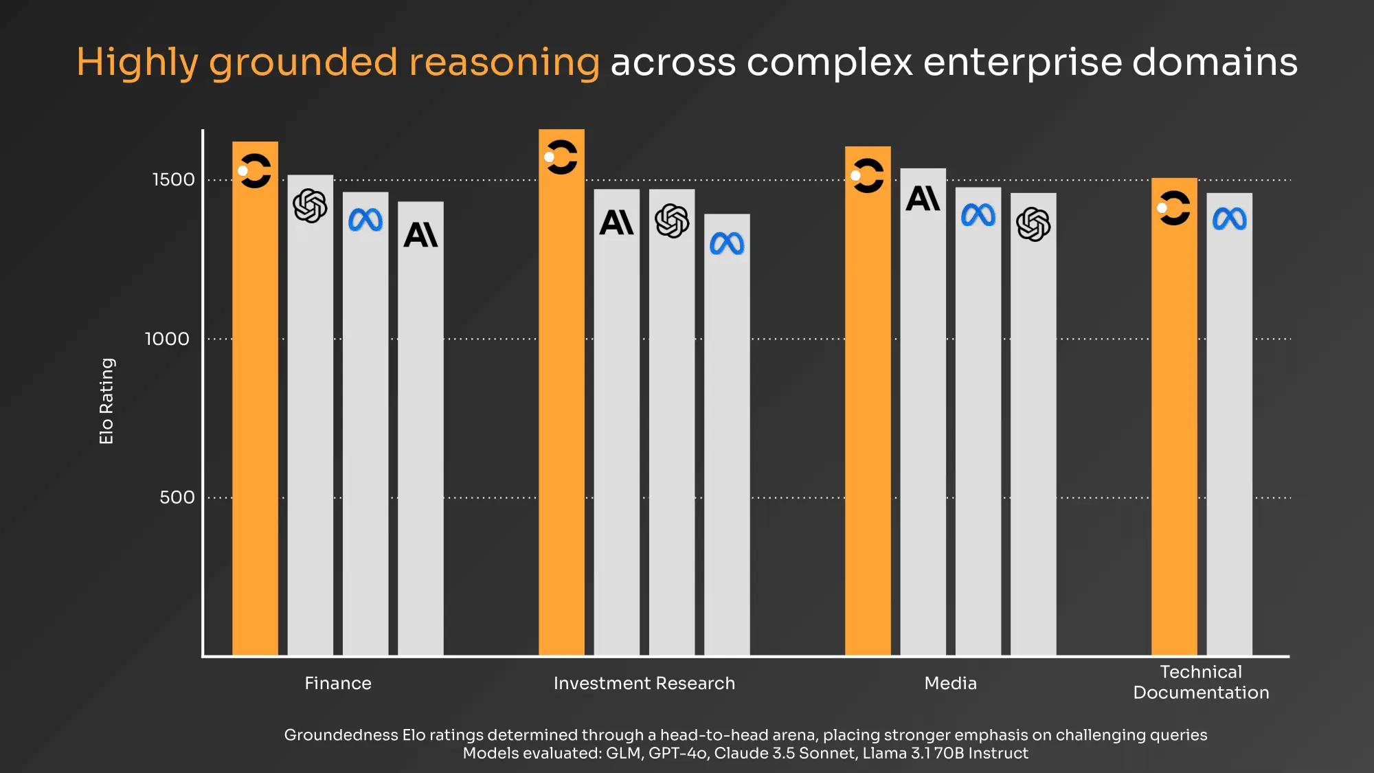 The GLM also outperforms leading foundation models on our proprietary customer benchmarks, demonstrating the GLM’s consistent and significant improvements in grounded reasoning across diverse enterprise contexts. We use four evaluation datasets spanning different customer verticals, curated by our in-house data team to target failure modes commonly observed in complex, noisy enterprise scenarios – where models often struggle to reason effectively over retrieved knowledge. We compute Elo scores through a head-to-head arena, thereby placing stronger emphasis on difficult cases (i.e., correct answers on samples that many other models get wrong yield higher Elo gain).