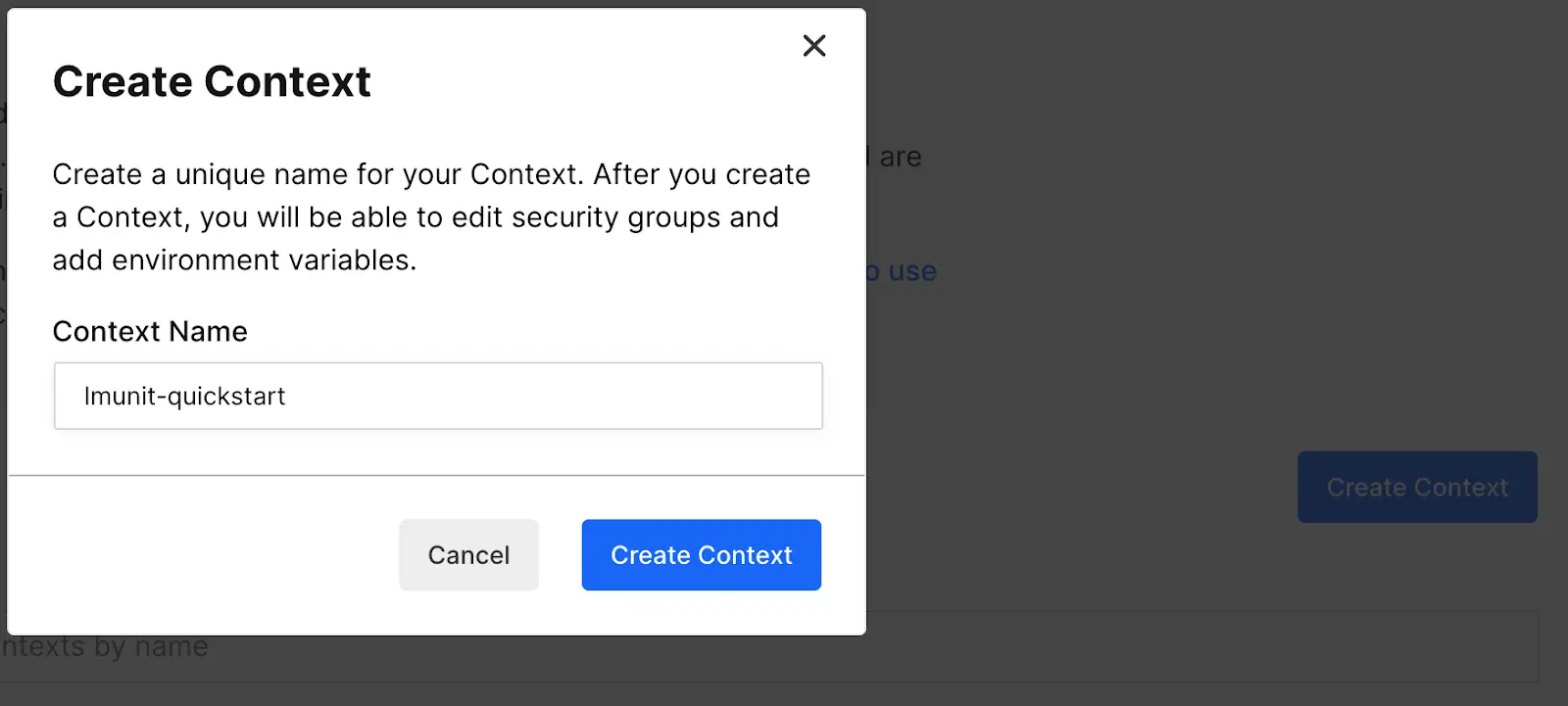 - Name your context lmunit-quickstart. We’ll use this name later in your pipeline