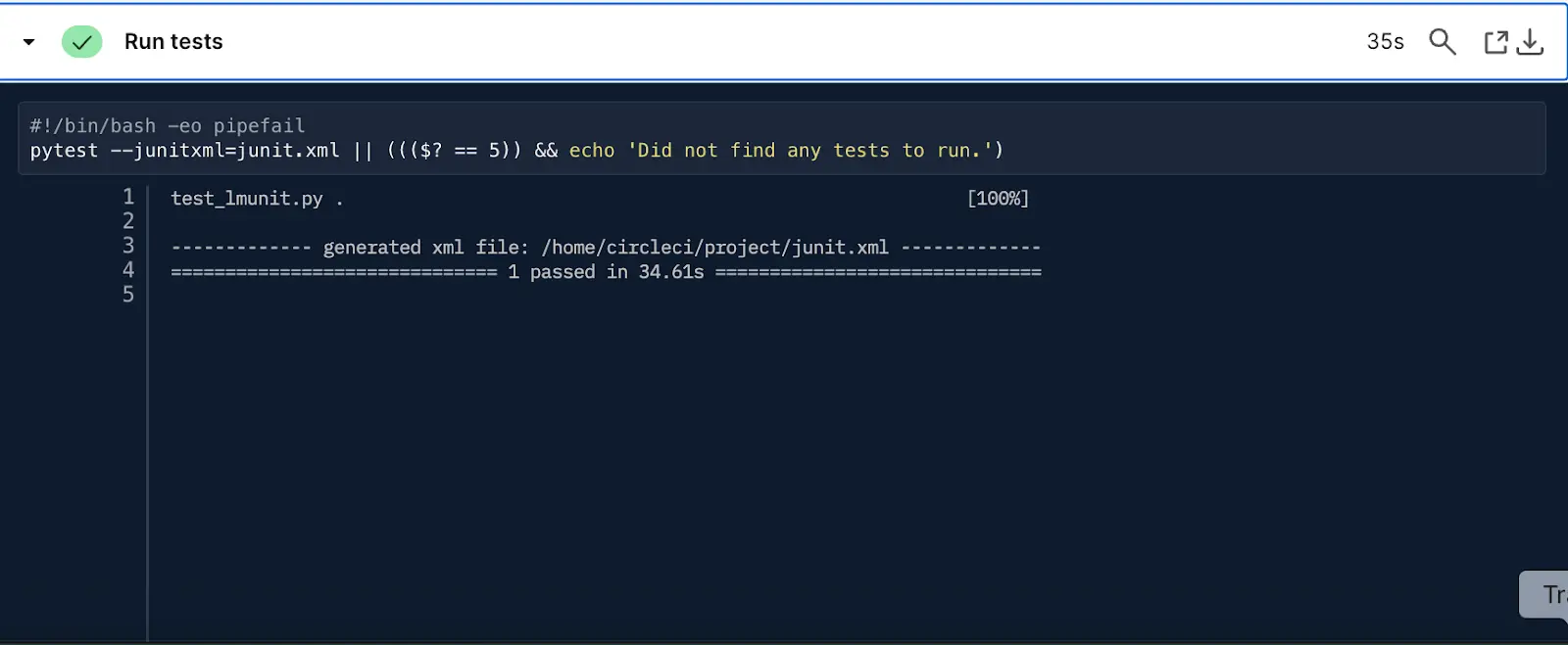 Test results are stored as JUnit formatted XML, and can be seen in the tests tab on your job. In this example, all tests pass. You may also view your test suite performance over time using CircleCI’s tests insights features.