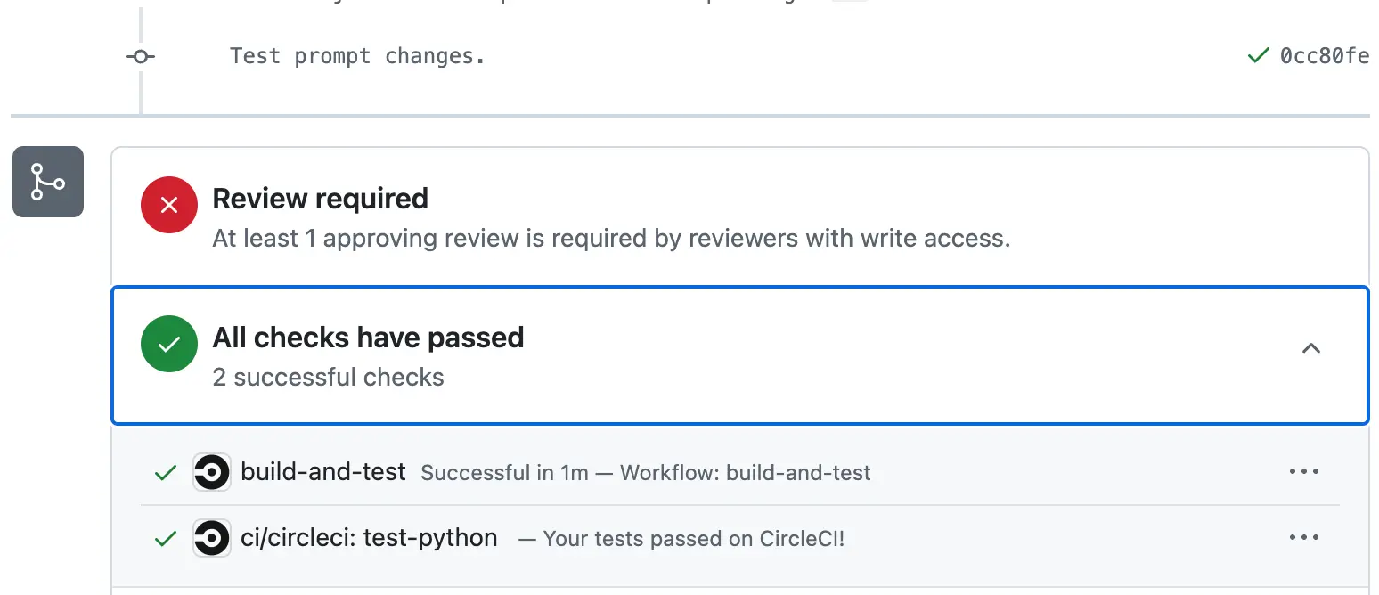 Finally, CircleCI will send the results back to your VCS as a status check to prevent merging breaking changes to your AI application.