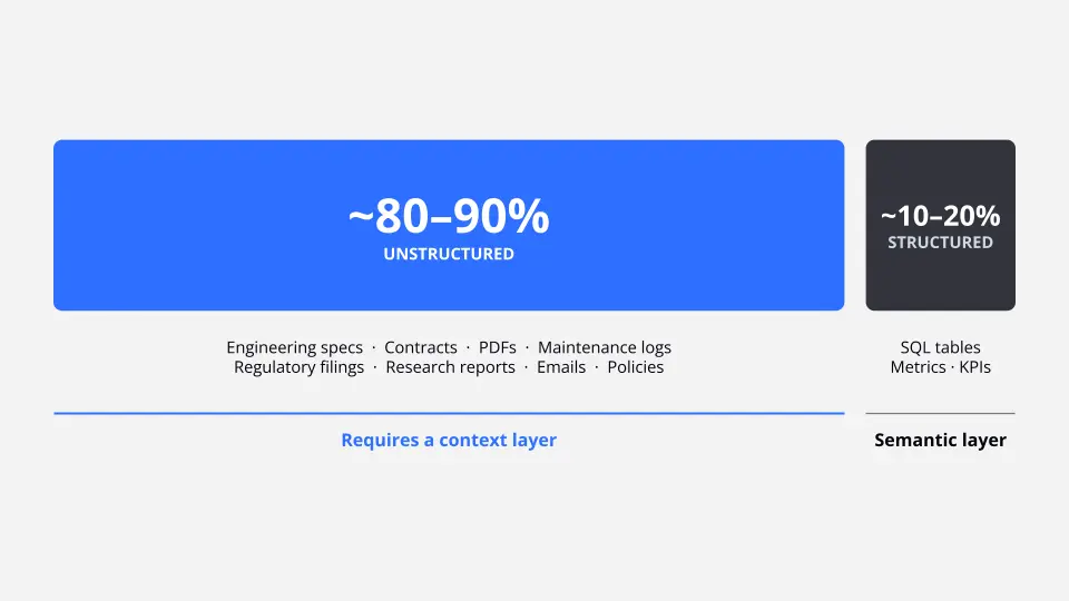 Can a semantic layer support AI use cases? Yes, for a specific subset. Semantic layers are increasingly valuable for text-to-SQL interfaces, where an AI system translates natural language questions into structured queries. For anything involving structured, tabular data, a semantic layer significantly improves AI accuracy. But for use cases that require reasoning over unstructured documents — engineering specs, legal contracts, research reports — a semantic layer alone is insufficient.