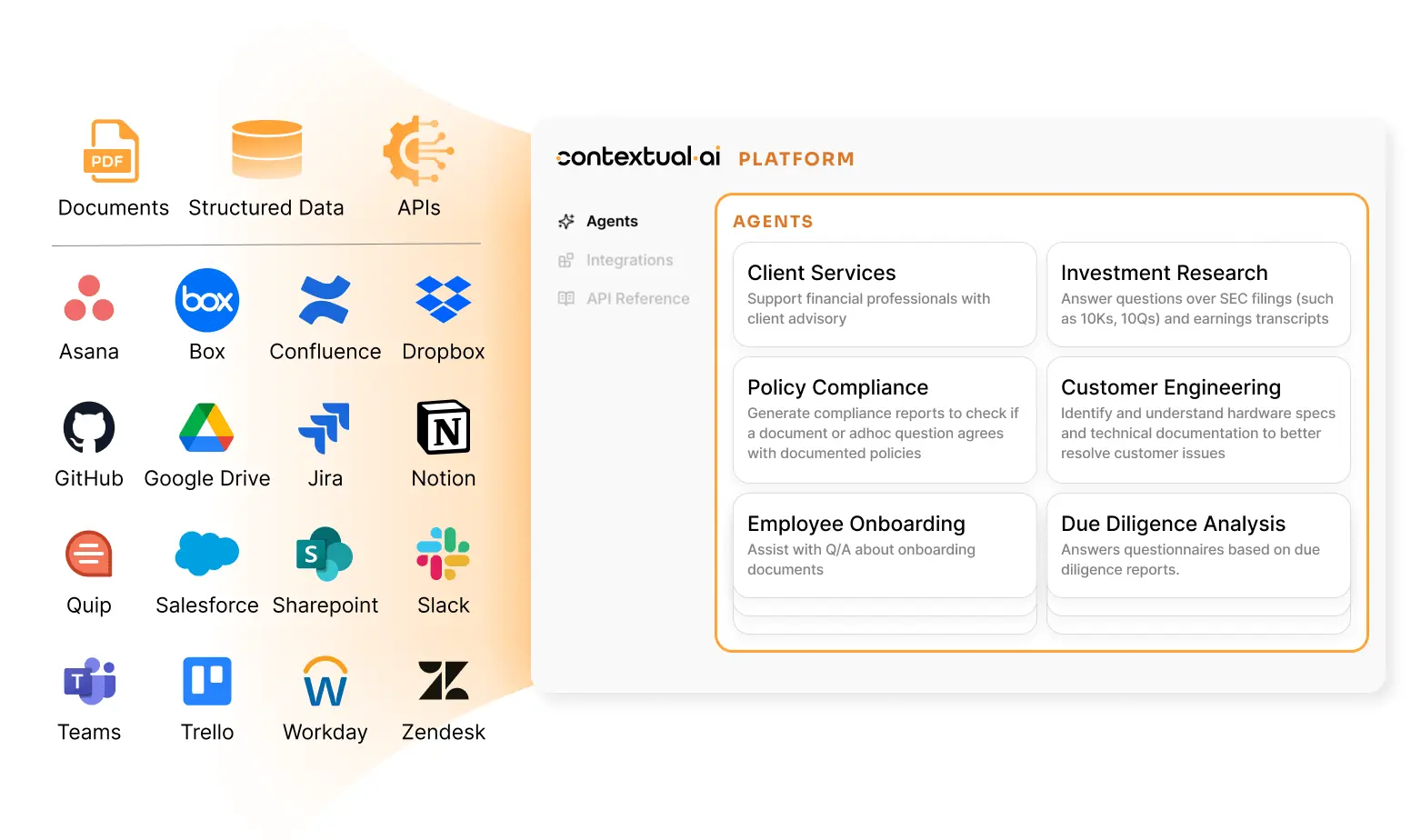 The Contextual AI Platform solves for these challenges by providing broad support for unstructured and structured data within a single, unified platform. Our comprehensive approach eliminates the need for organizations to manually piece together disparate components for different data types, while also delivering state-of-the-art performance out of the box.