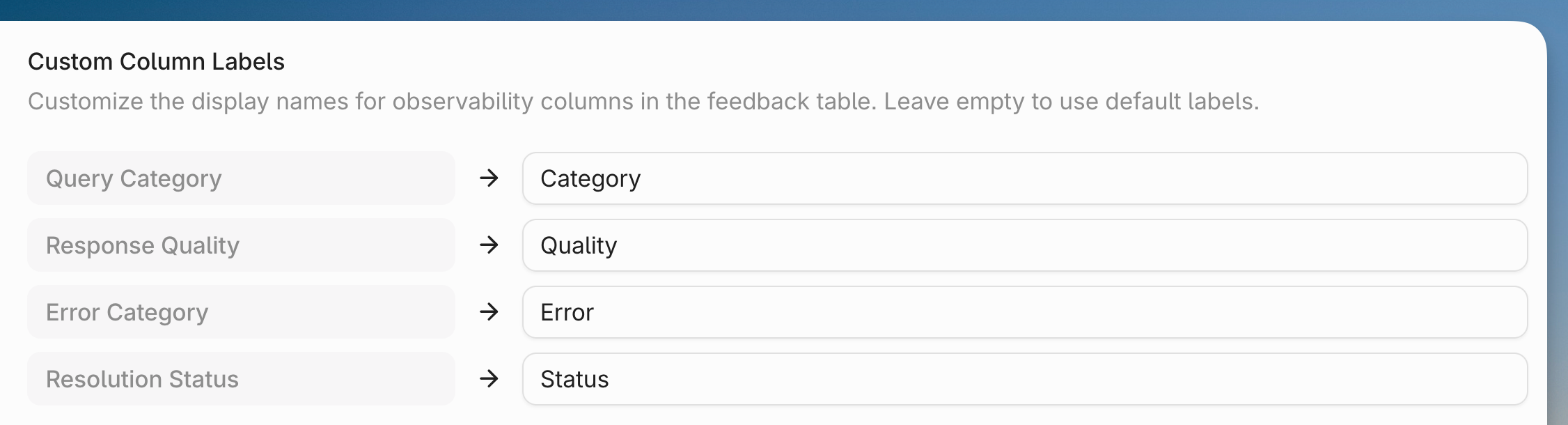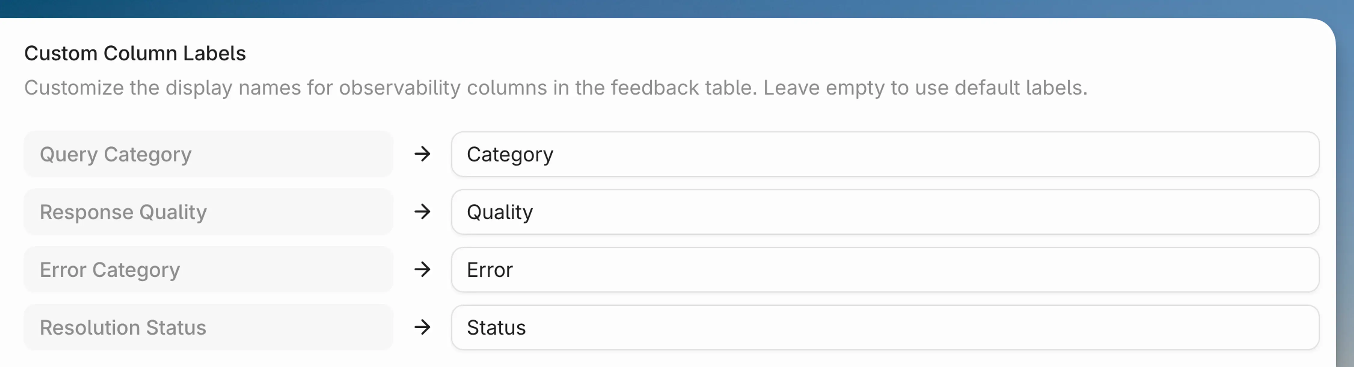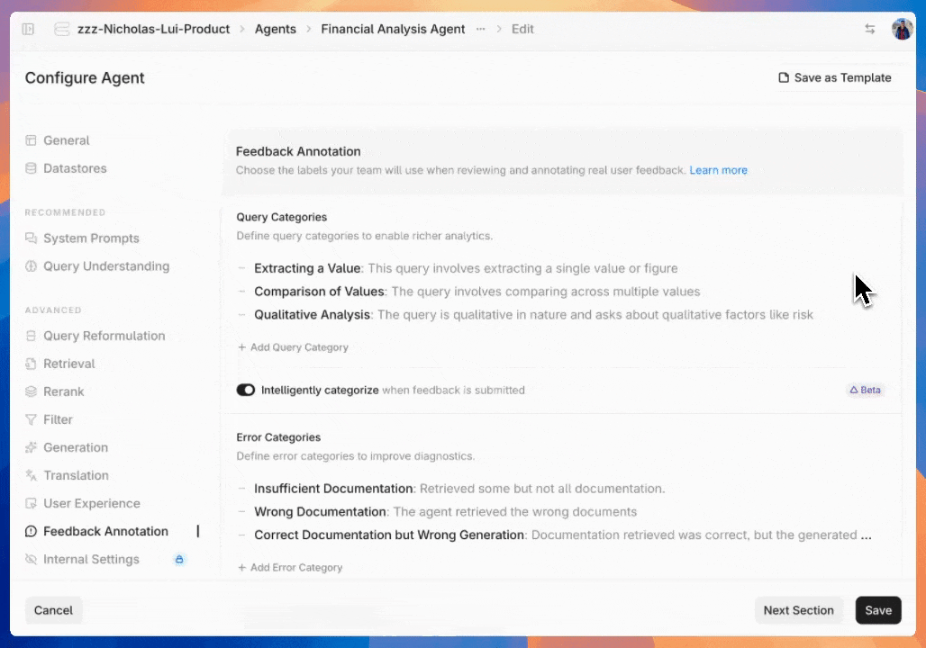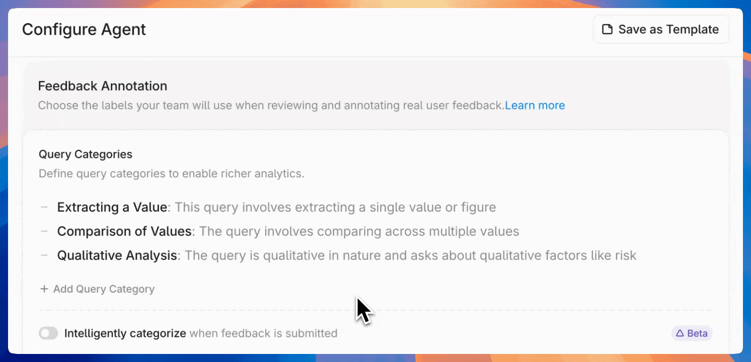 After reviewing initial feedback, developers can set up annotation workflows by creating custom category fields in the agent configuration interface. By default you can create customized categories for queries, errors, response quality, and resolution status.