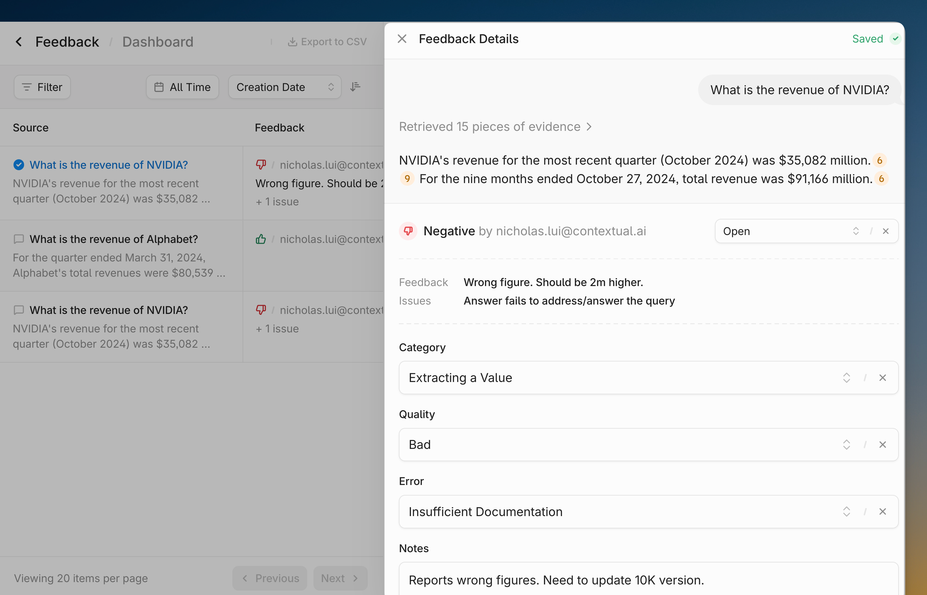 “Contextual’s new feedback collection and annotation workflow brings everything into one place—letting us annotate queries, track resolution, and visualize results seamlessly. It’s improved our team’s productivity and reduced the number of tools we need to manage QA.”