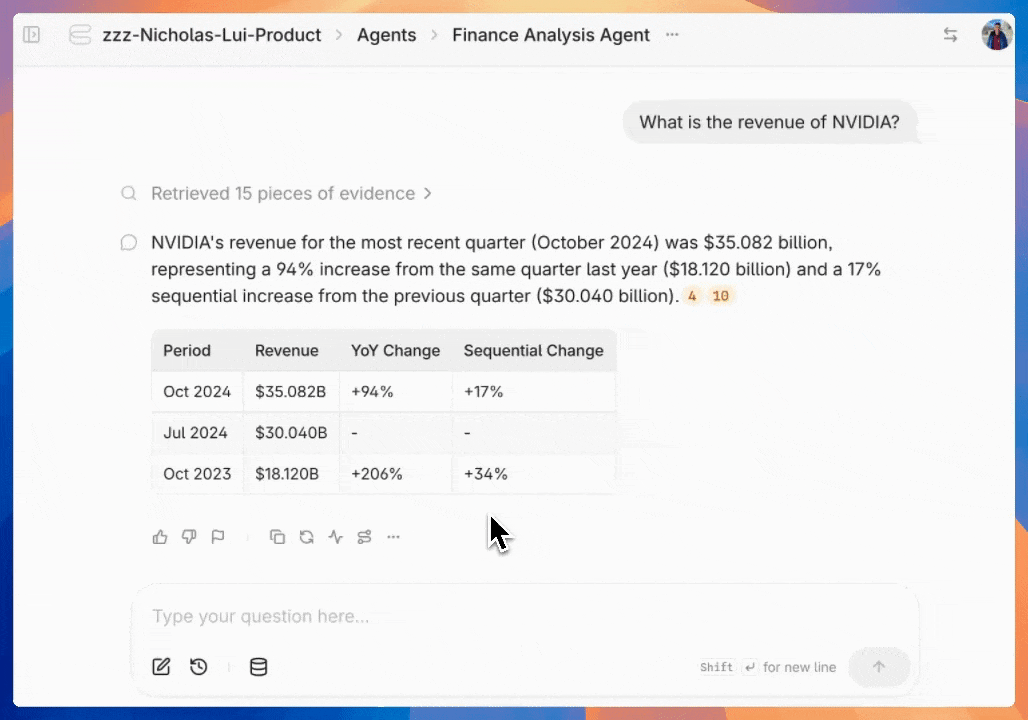 Get instant root cause analysis by clicking any agent citation to see the prompt, output and source document chunks.