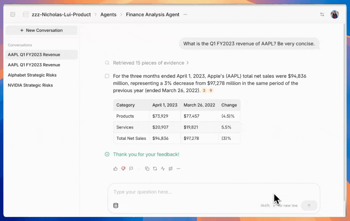 Kick off user evaluation by setting up the feedback workflow in the agent configuration settings. After submitting a query, users are prompted to rate the agent’s response and select optional issue labels. You can customize these labels and make feedback required.