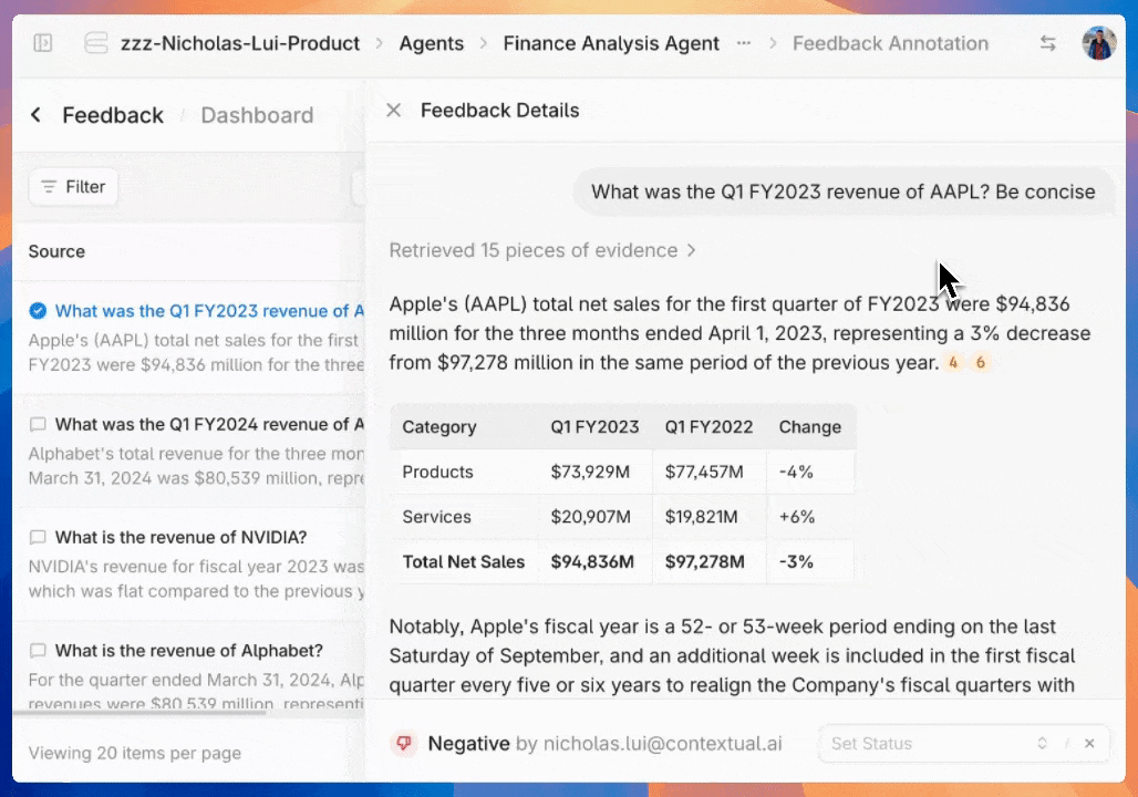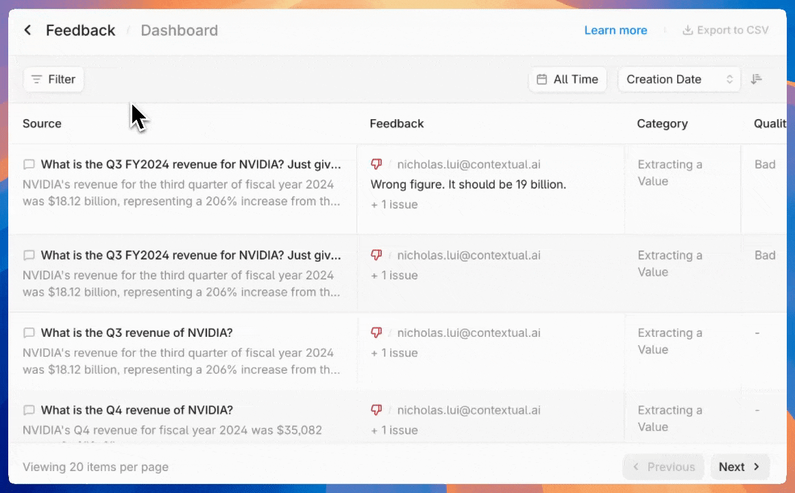 AI teams can now audit and improve agent performance entirely within the Contextual AI platform. Collect, categorize, and visualize human feedback to resolve quality concerns around accuracy and use-case specialization —all without juggling separate spreadsheets, annotation tools, and dashboards.