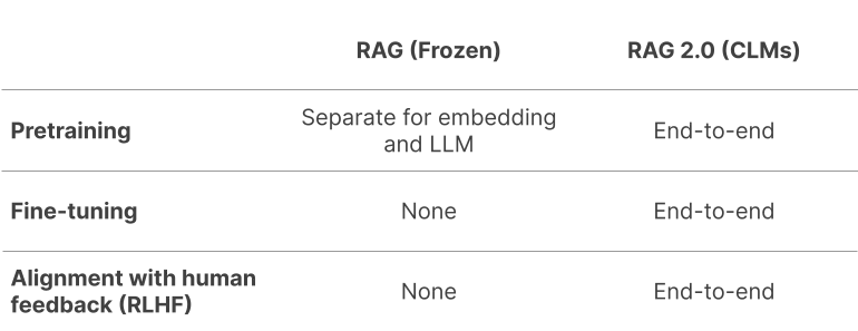 The history of deep learning has repeatedly shown that end-to-end optimization outperforms hand-tuned systems. We apply this approach to move beyond the limitations of RAG and have developed RAG 2.0. To sum it up: if you know that you are going to be doing RAG, you should train the system for doing RAG.