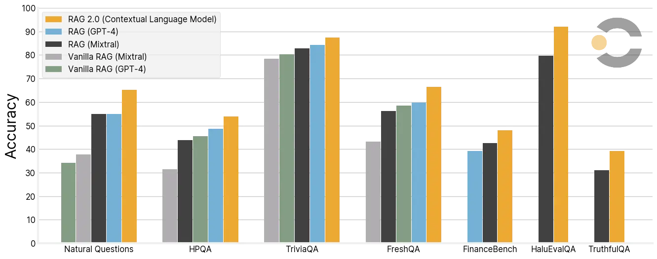 Contextual Language Models, trained with RAG 2.0, perform significantly better than existing RAG systems across all of our benchmarks. Natural Questions (NQ), HotpotQA (HPQA), and TriviaQA use the exact match metric. Since HaluEvalQA and TruthfulQA require logits, GPT-4 cannot be evaluated directly on those tasks. Vanilla RAG is zero-shot; what we call RAG includes few-shot demonstrations, careful chunking, and manual prompt engineering. Significant effort was spent on strengthening the baselines.