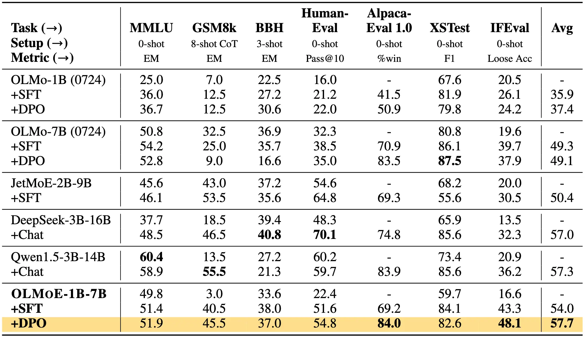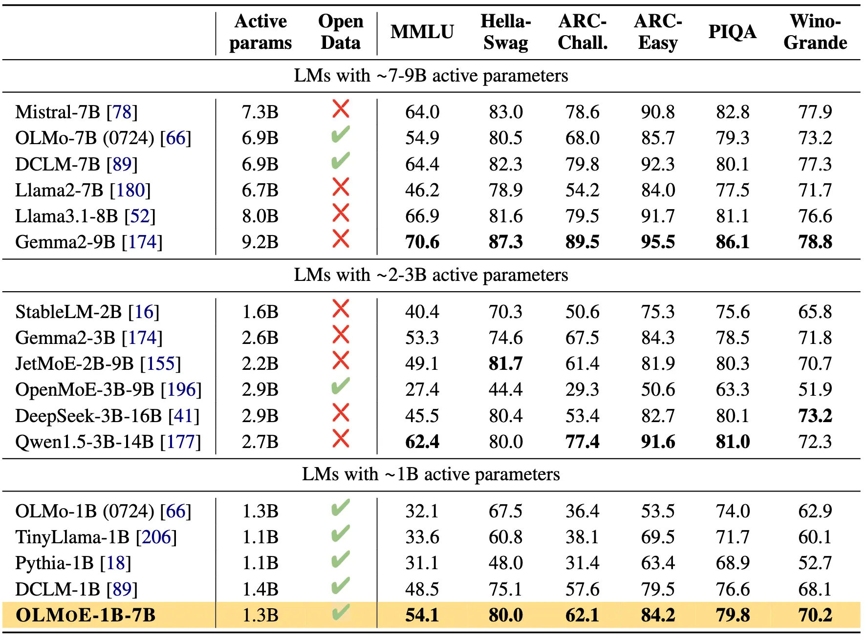 Aside from getting state-of-the-art results on important benchmarks and leading to substantial efficiency gains with a minimal number of parameters, we believe that our fully open release will help the community explore other open questions that weren’t possible before, for example: Do MoEs saturate earlier than dense models when overtraining? Do MoEs generally work better for GRIT-style models? Can OLMoE be jointly optimized with the retriever to build a more efficient RAG pipeline?