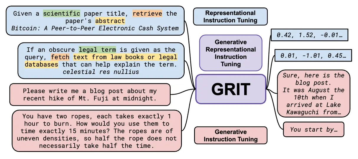 We introduce GRIT (Generative Representational Instruction Tuning), a novel technique for using instructions to train language models to be good at both representation and generation. In this new paradigm, the model simply learns to follow instructions along the lines of “represent this piece of text so that a doctor can find relevant information to make the right decision”. We jointly optimize the same core model with both a contrastive and a causal loss during instruction tuning. For more details, please see our paper.