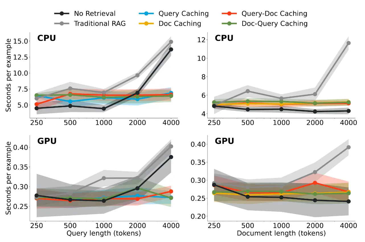 There are different ways to approach this: you can either cache the query, the documents, or both, and in different orders – see the paper for more details. Our best method leads to more than 60% efficiency gains over naive RAG, and is actually quite close to the time it would have taken to directly generate without retrieving at all: