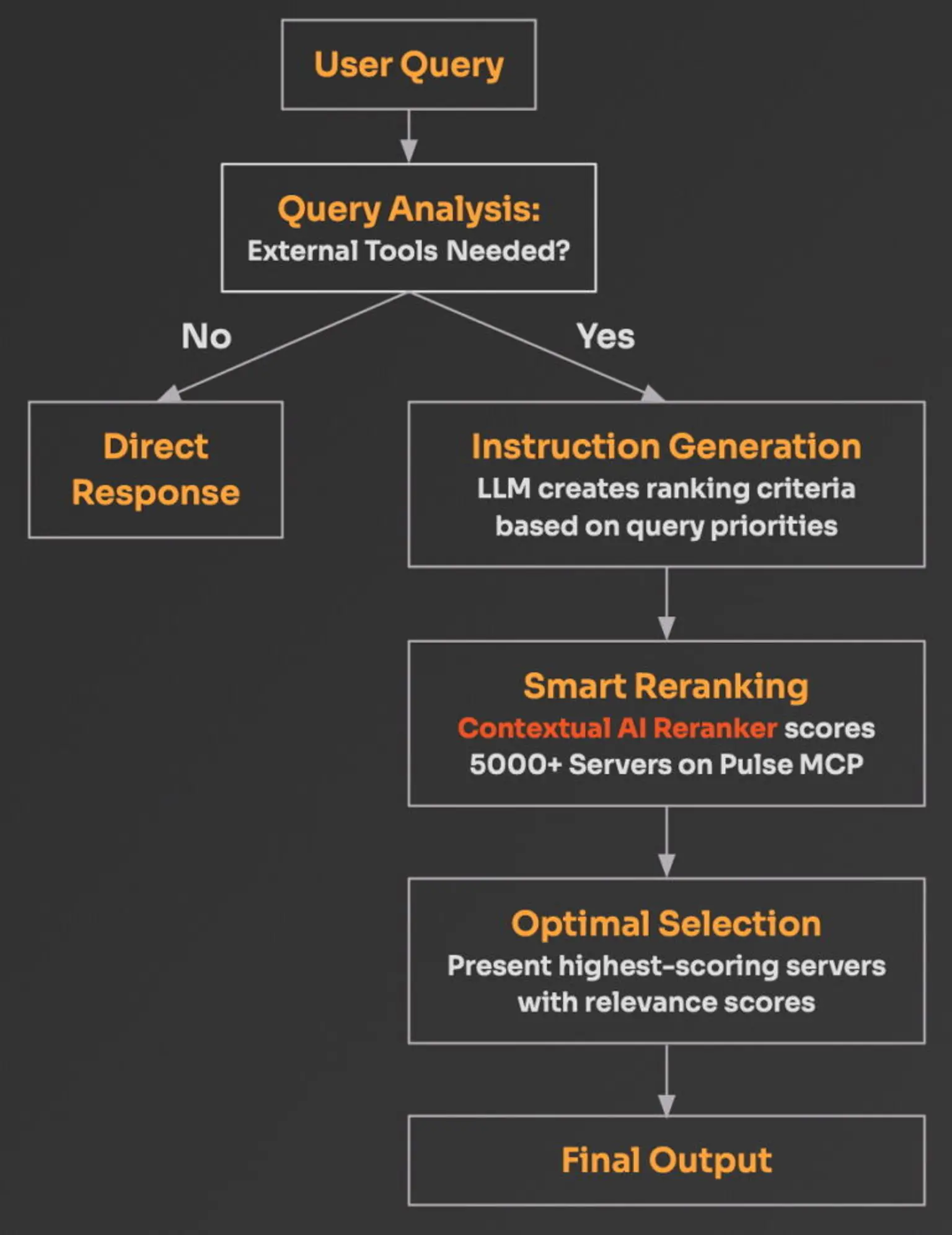 - Smart Reranking: Contextual AI’s reranker scores all 5000+ servers on PulseMCP against these criteria;
