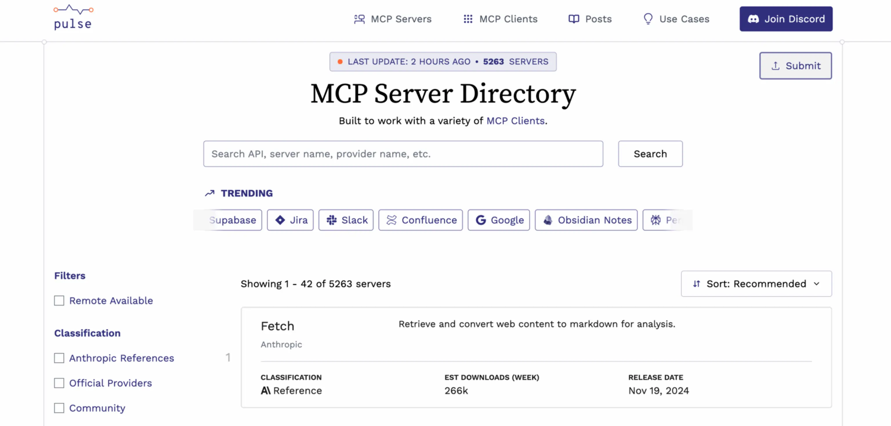 Screenshot of the PulseMCP Server Directory on July 31, 2025