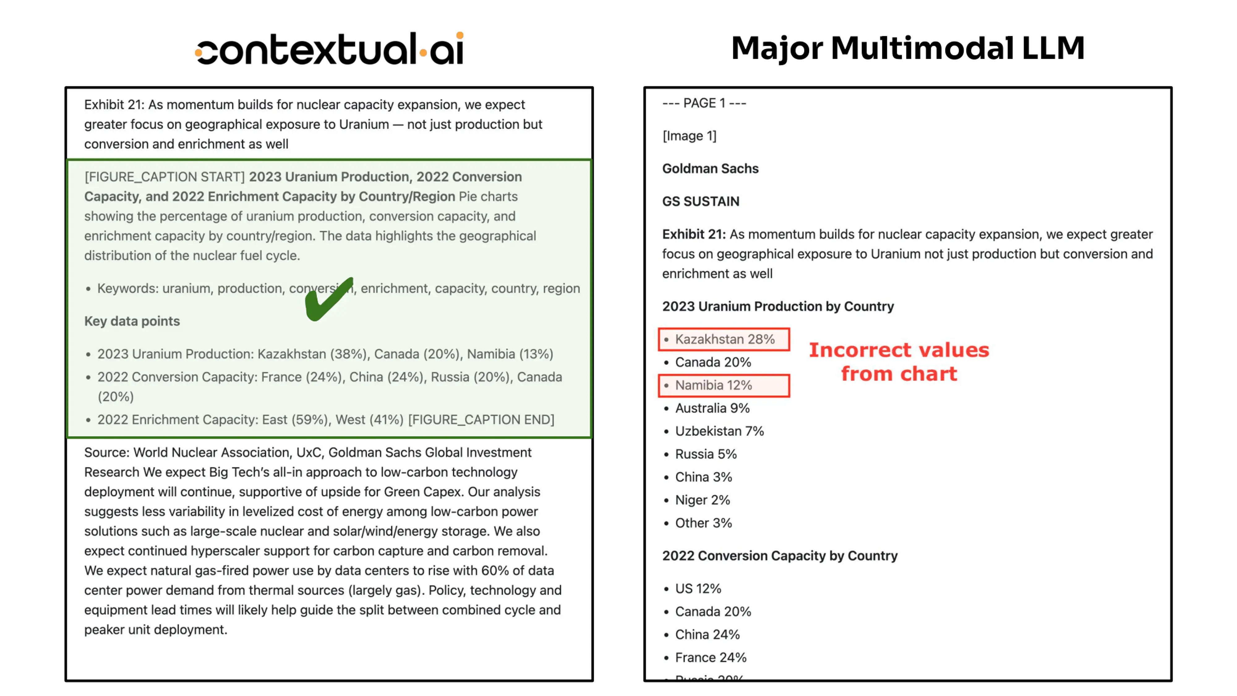 The parsed output from the Goldman Sachs’ Research Report. Contextual AI’s solution comprehensively and accurately captions the figures. A major multimodal LLM misplaces the values in the first chart.