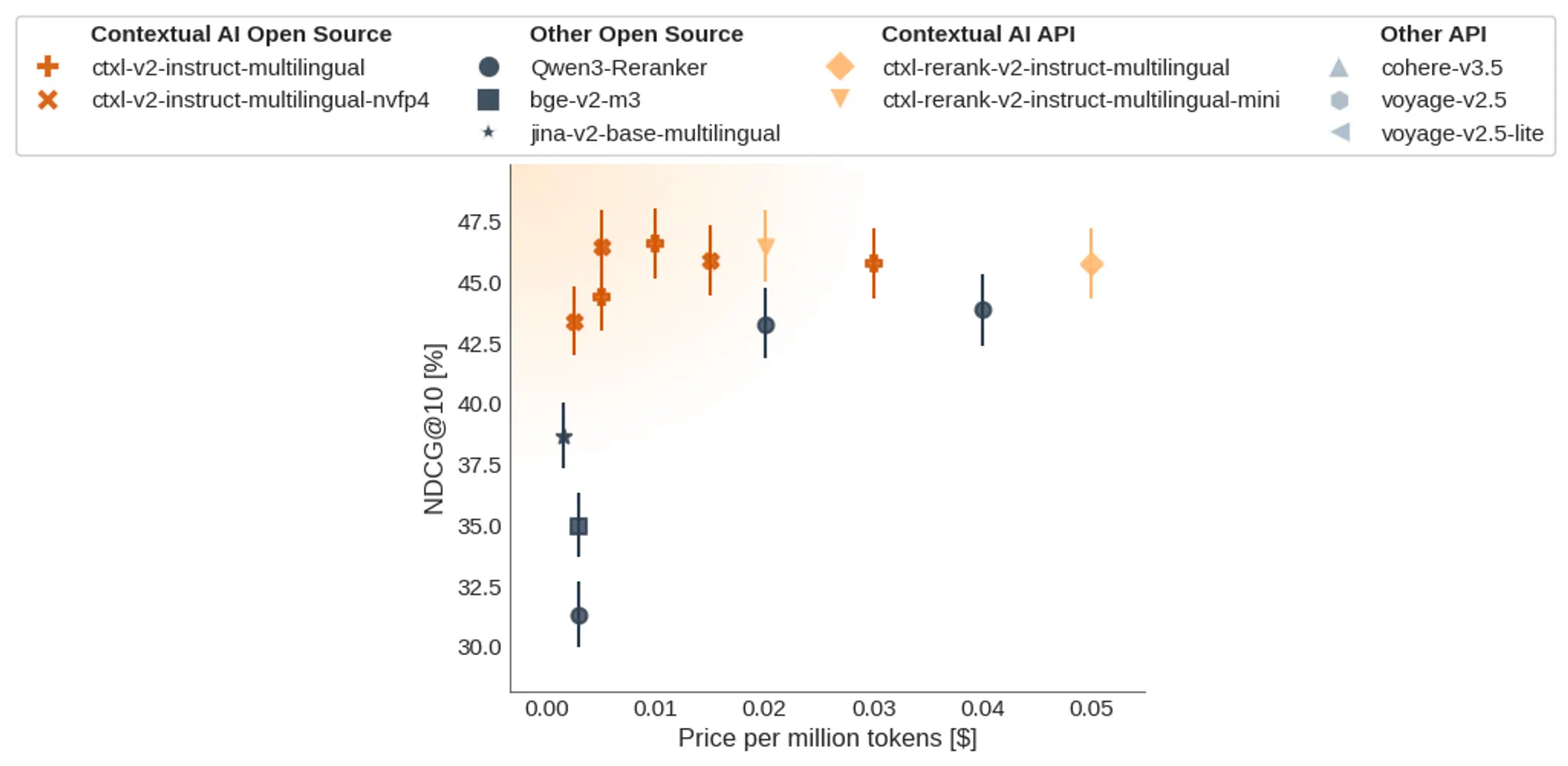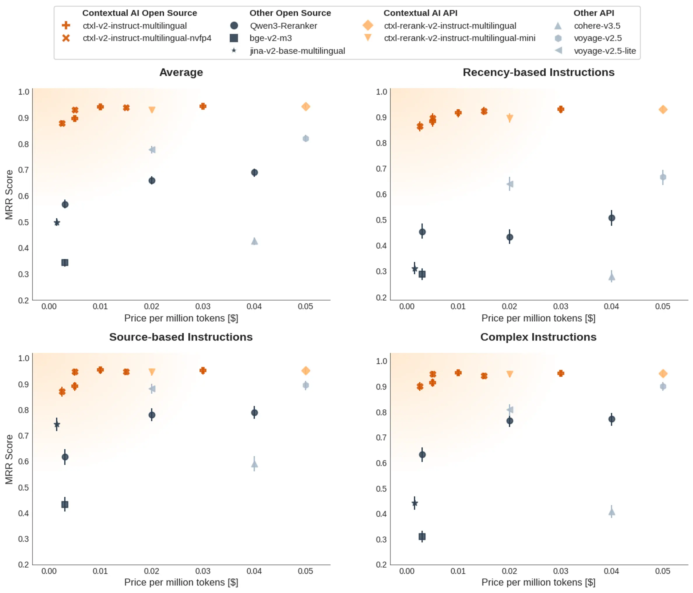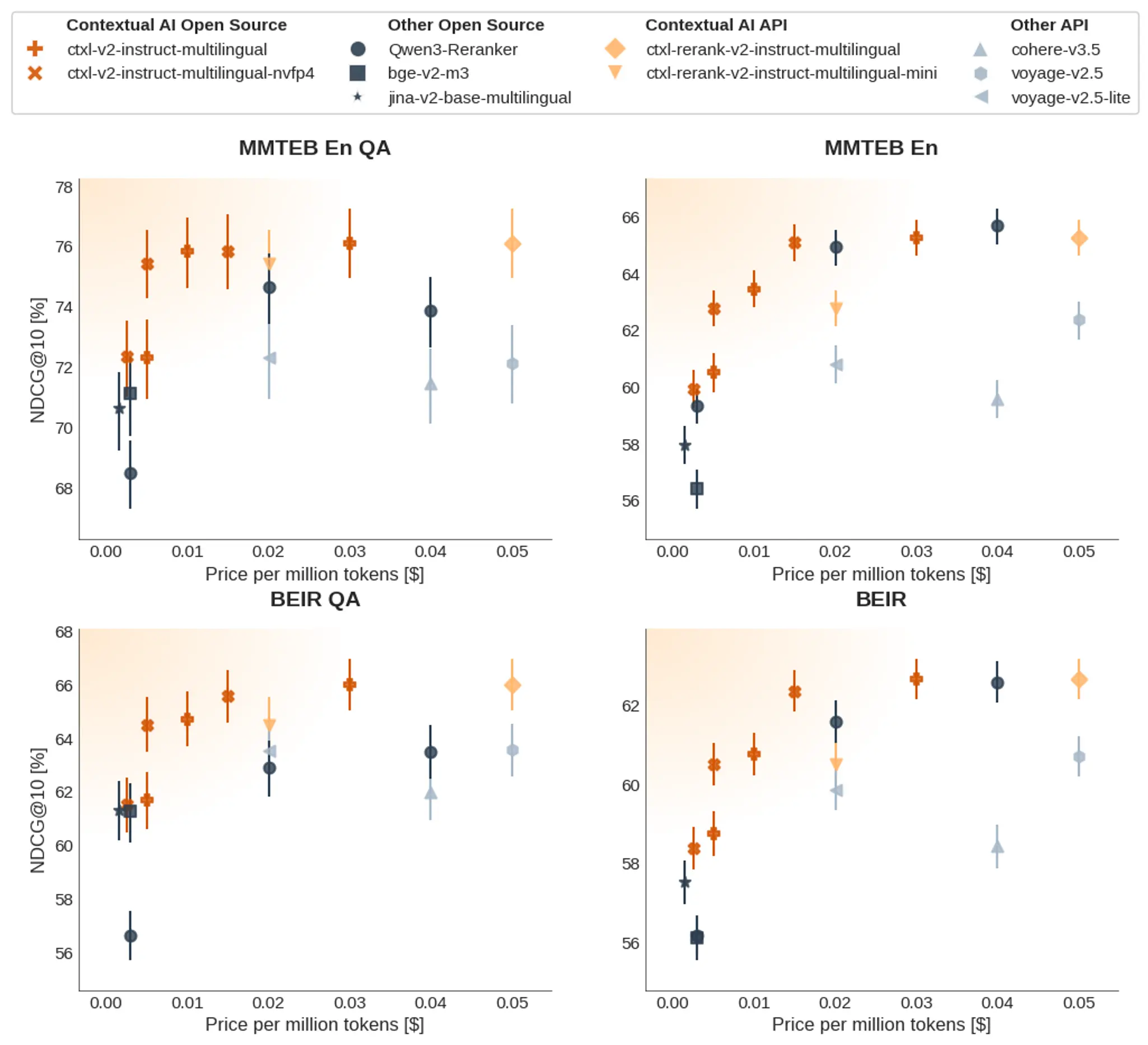 Figure 1. Performance vs price [1] (per million tokens) for rerankers across four benchmarks. Colors denote provider/source categories with Contextual AI models in warm hues and others in cool hues. Lower cost is to the left and higher performance is upward, as indicated by the orange gradient. The top-left panel uses a different performance metric and y-axis range from the others (MRR vs. NDCG@10), which explains the smaller error bars [2].