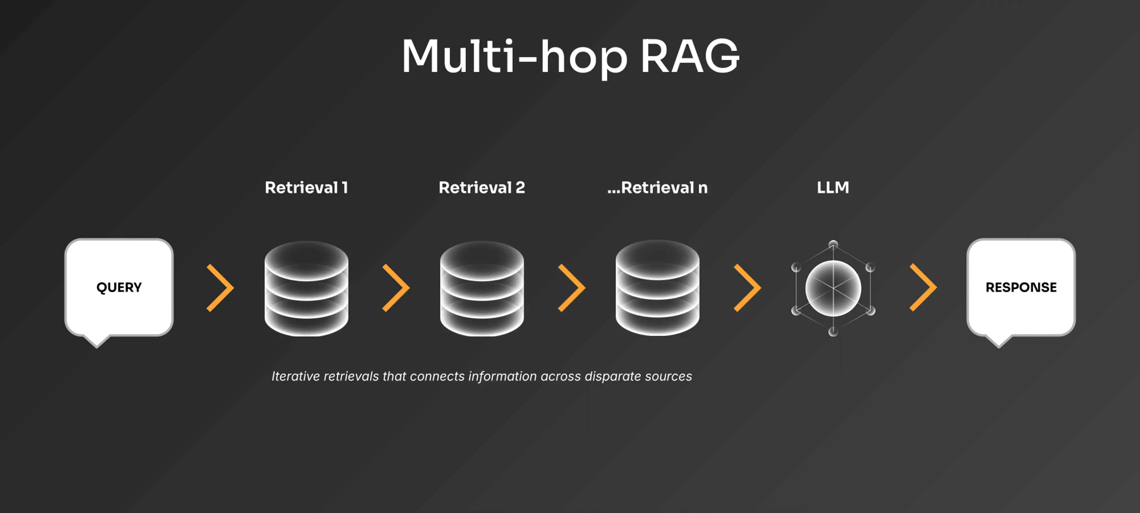 Multi-hop RAG enables systems to follow chains of connected information across multiple documents when a single retrieval pass is insufficient. Unlike basic RAG that retrieves information directly related to the query, multi-hop retrieval can answer questions that require connecting disparate pieces of information. For instance, to answer “Where did the CEO who announced our new sustainability initiative go to college?”, the system might first retrieve documents about the sustainability initiative to identify the CEO, then use that information to find biographical details in different documents.